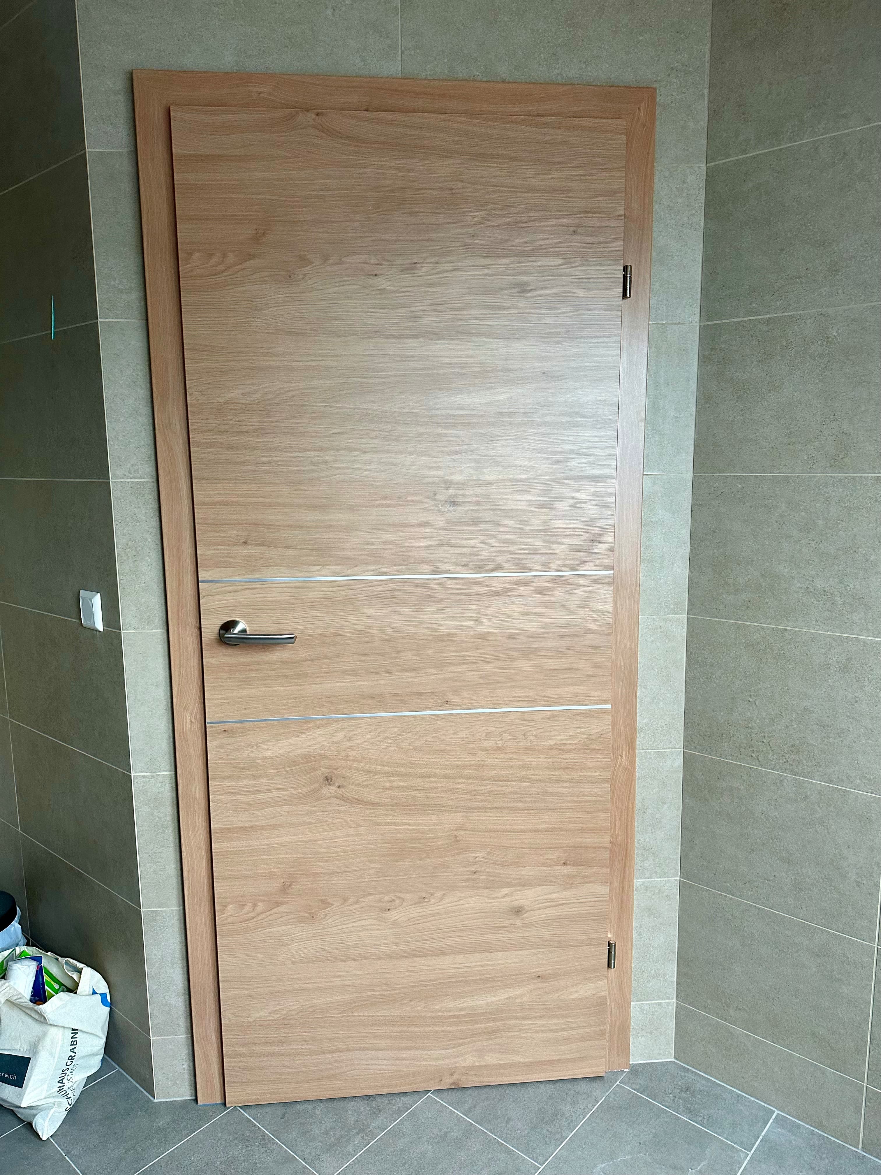 Diese Tür verbindet natürliche Holzoptik mit klaren Designelementen: Die Oberfläche zeigt ein strukturiertes Eichen Dekor mit durchlaufendem quer ausgerichteten Maserungsverlauf. Zwei feine Lisenen in matter Chromfarbe setzen dezente Akzente, ohne das Erscheinungsbild zu überladen. Eine Rosettengarnitur mit matt gebürstetem Edelstahl rundet das Gesamtbild ab und sorgt für ein hochwertiges Finish, das gut in moderne Wohnräume passt.